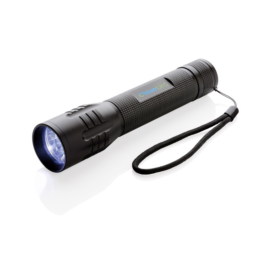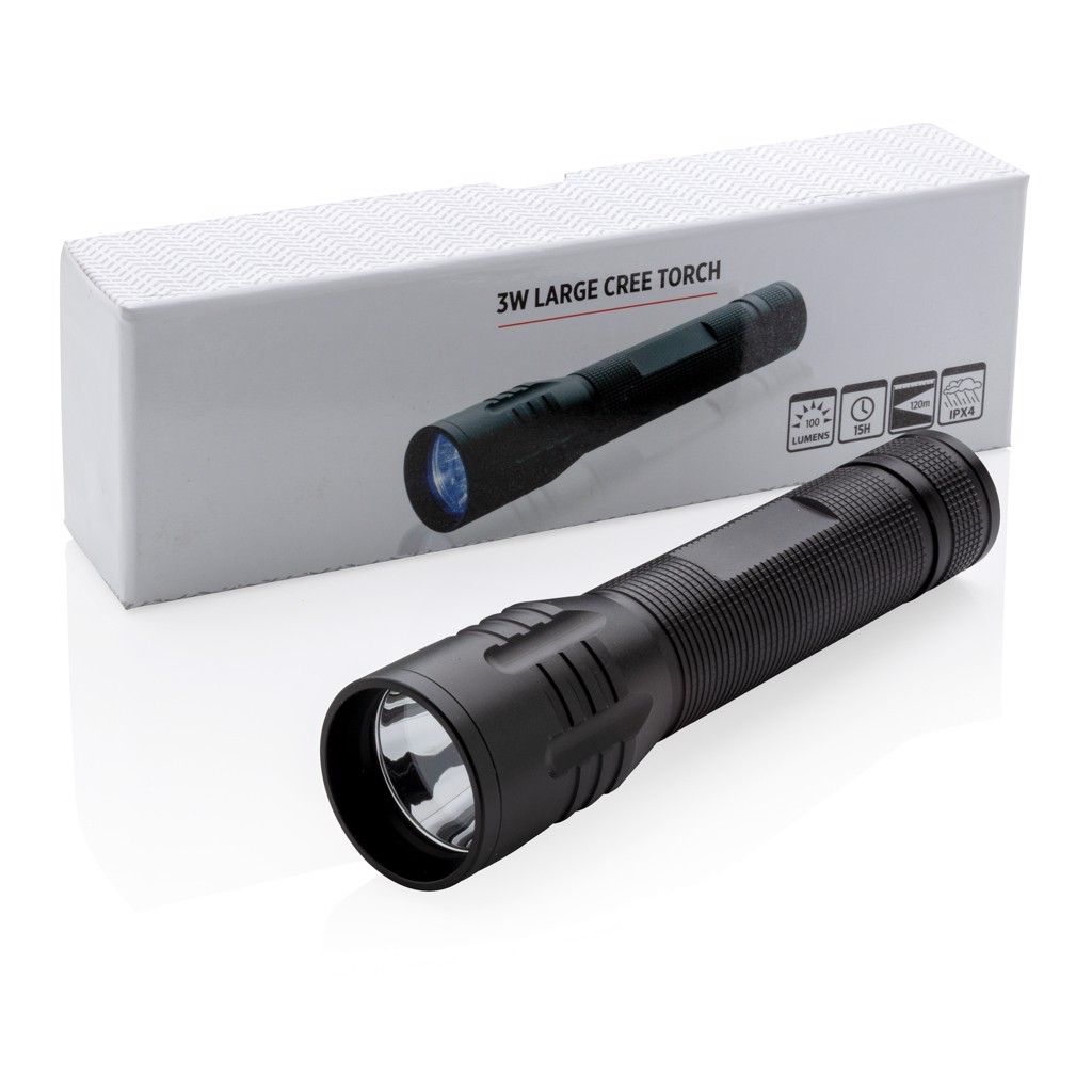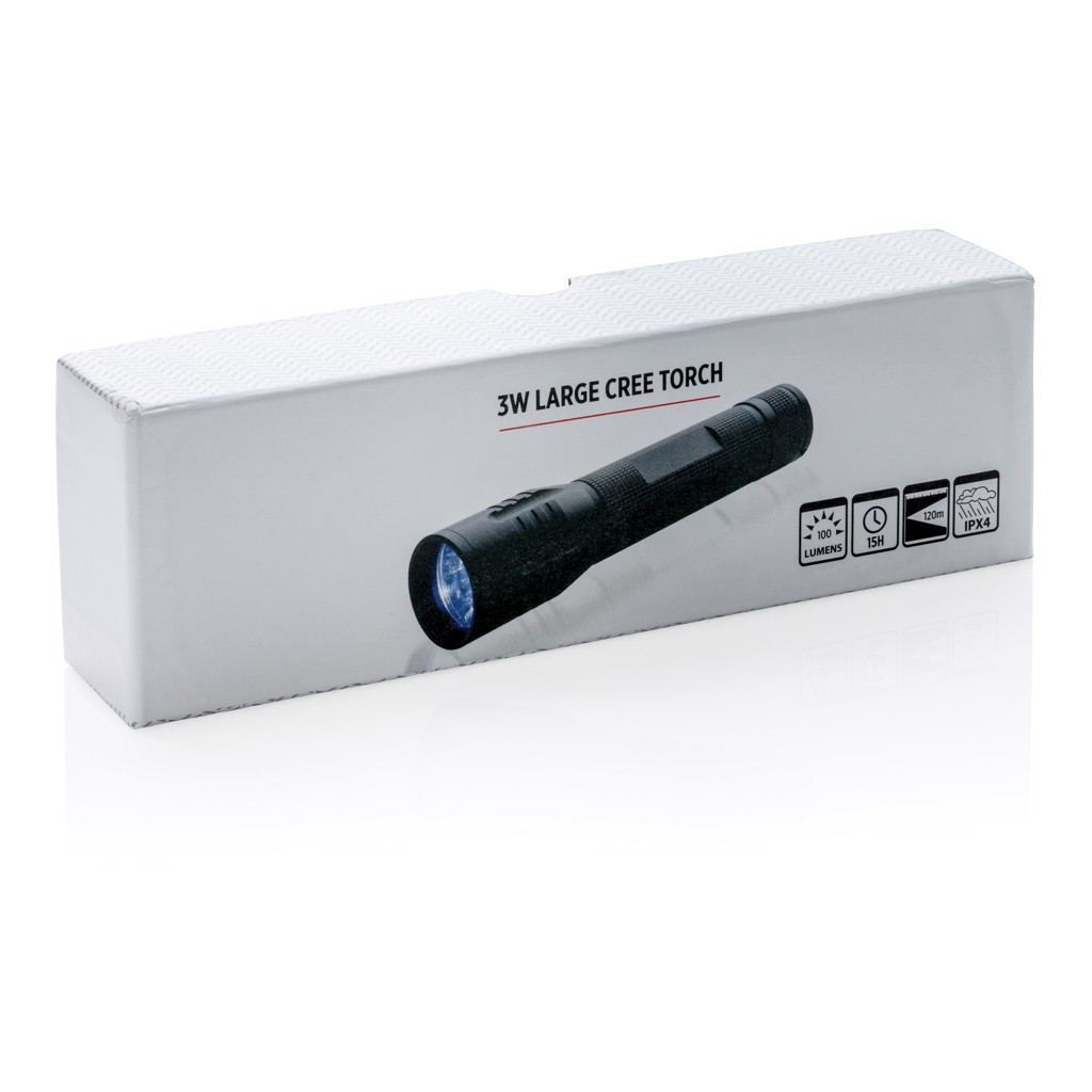 Super bright and strong 3W CREE torch perfect for longer performance. The aluminium torch has special CREE led’s that light up much brighter than regular LED lights for perfect exposure. Includes batteries for direct use. 100 lumen and working time of 15 hours. Made out of durable aluminium.