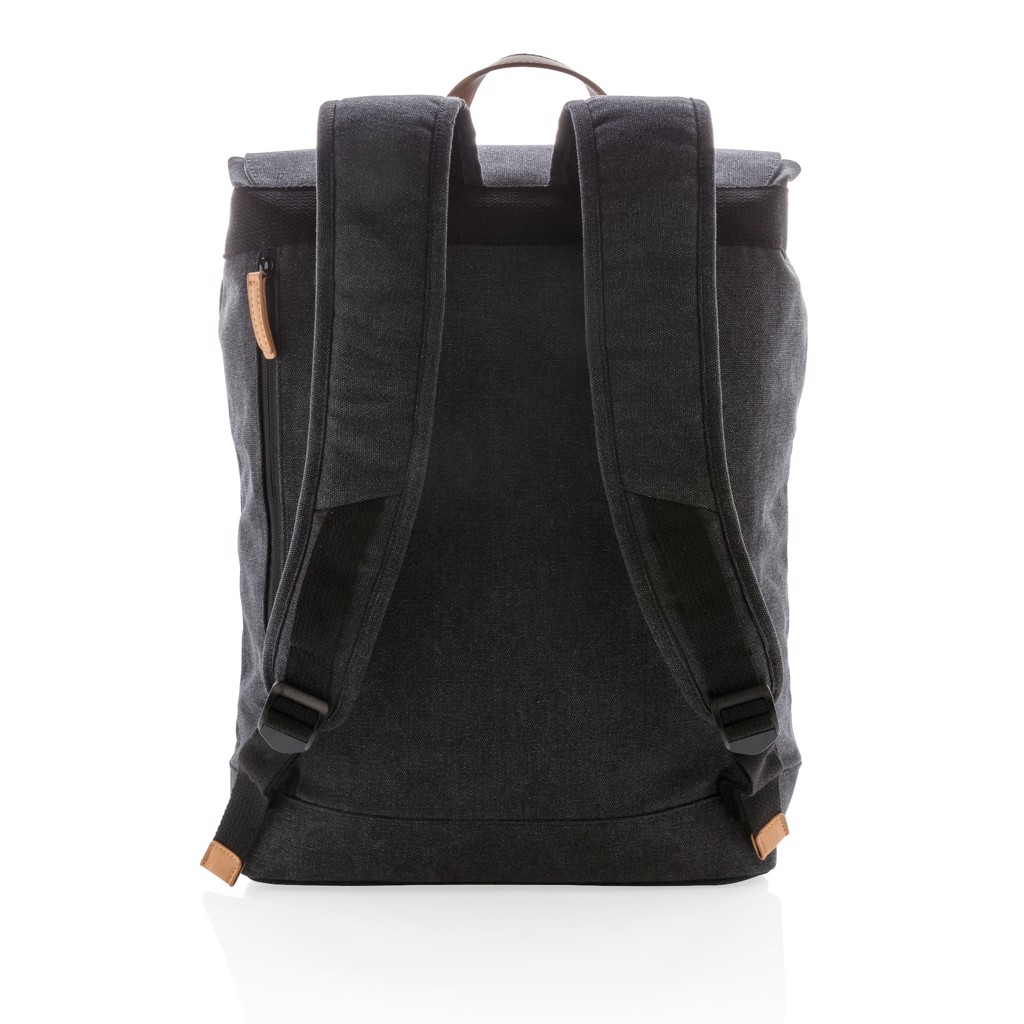Carry your essentials for casual travel in this durable canvas backpack. This model features a padded section for your laptop up to 15.6". The top flap closes with two imitation leather magnetic buckles. PVC free.