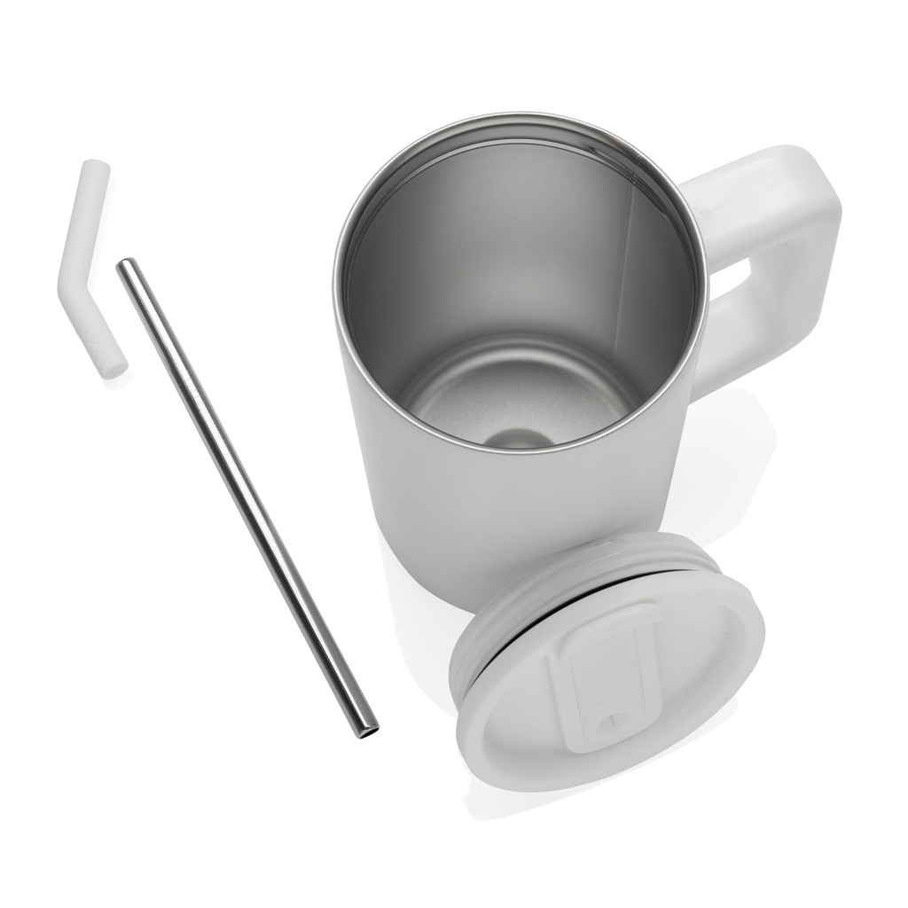 Indulge in the robust embrace of our generously sized 800ml mug – substantial and perfect for on your office desk. Its sturdy handle and broad base make it an ideal companion for your daily water intake in the office. Crafted from durable recycled stainless steel, this mug is designed to meet your hydration needs.This hefty, double-walled, vacuum-insulated mug comes equipped with a secure lid, straw, and a silicone straw tip. Versatile enough for both piping hot and ice-cold beverages, the screw-on lid offers a dual function – a convenient drinking spout or the option to use a straw. For optimal care, we recommend handwashing this substantial mug