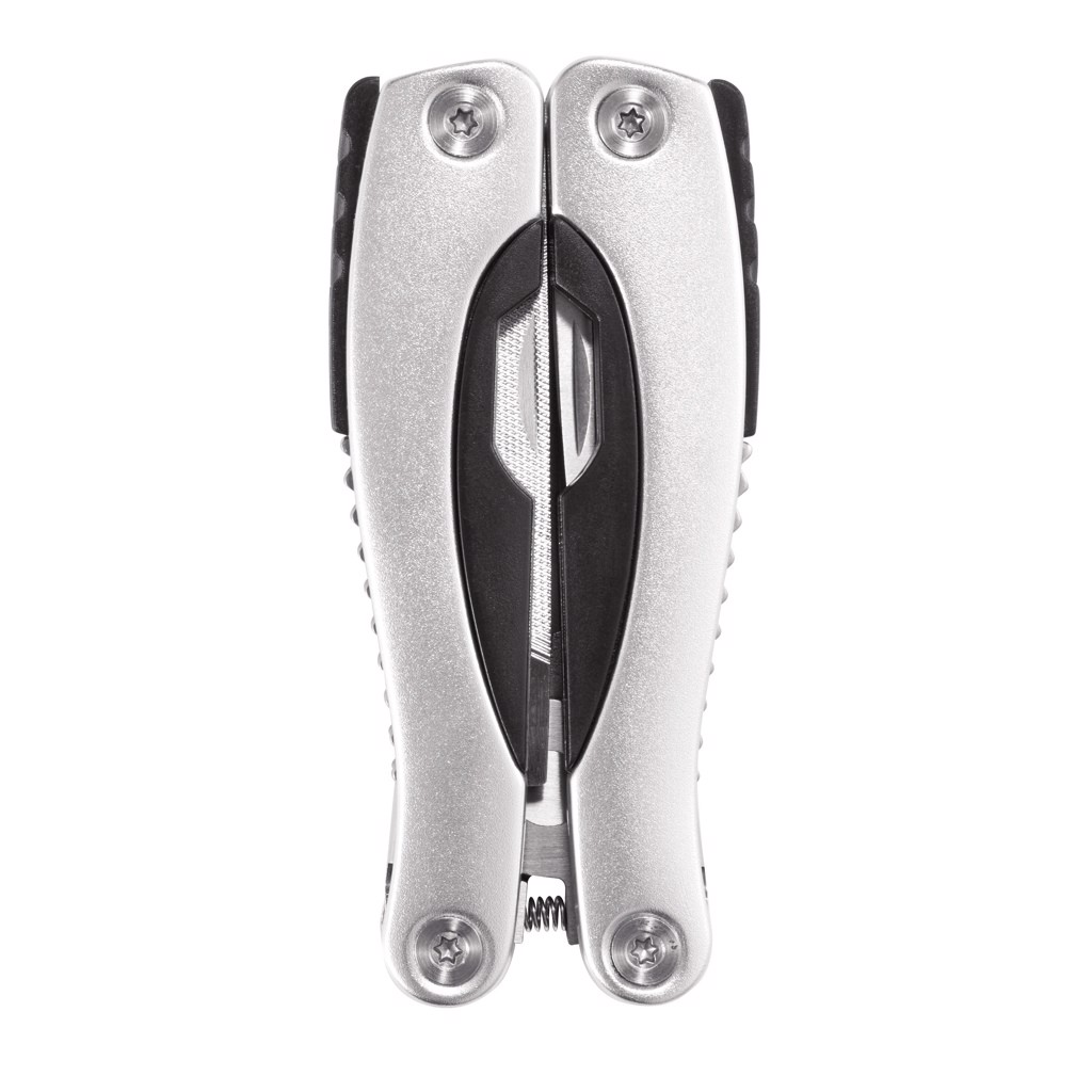 Aluminium multitool, handle with black details, 14 functions, packed in black 600D pouch.