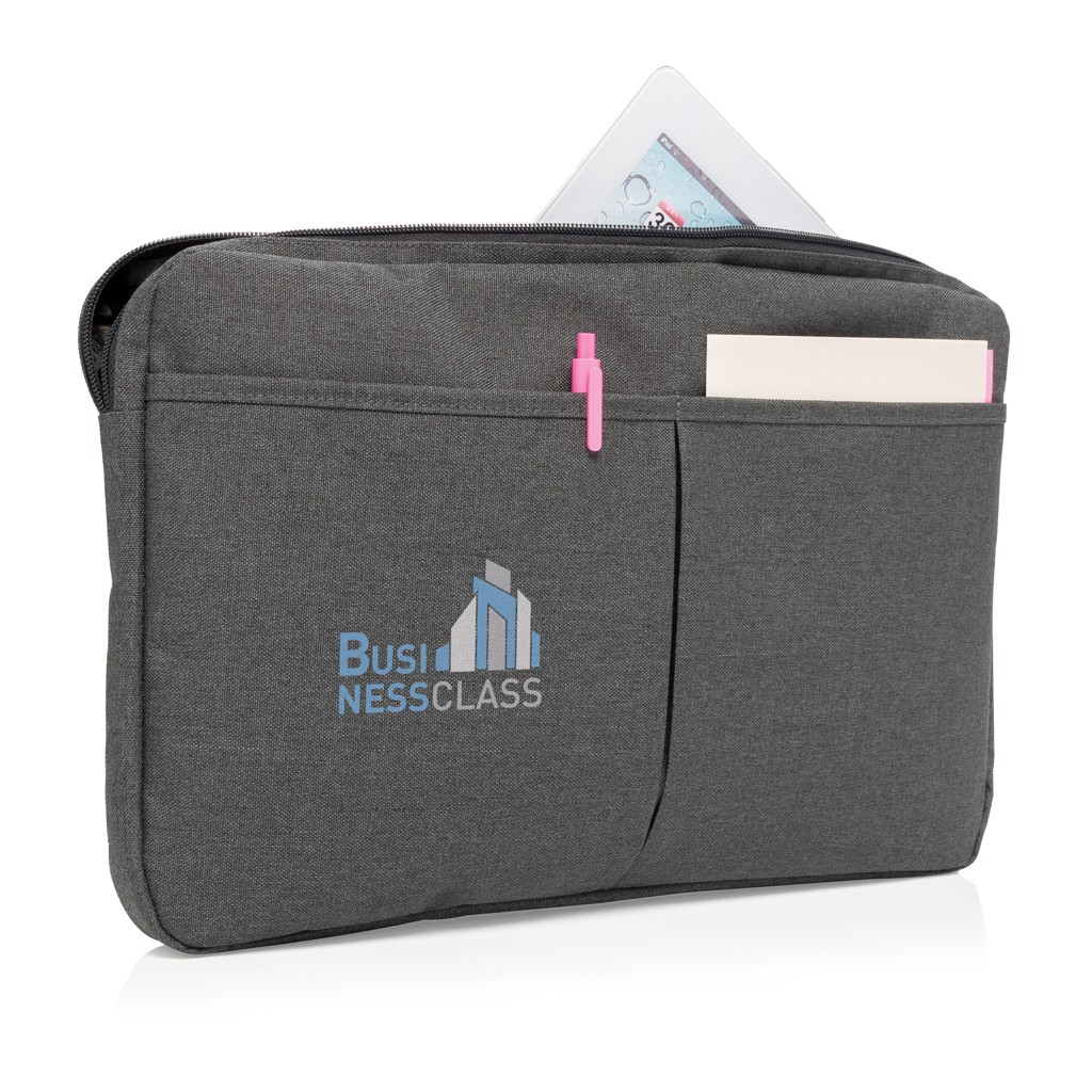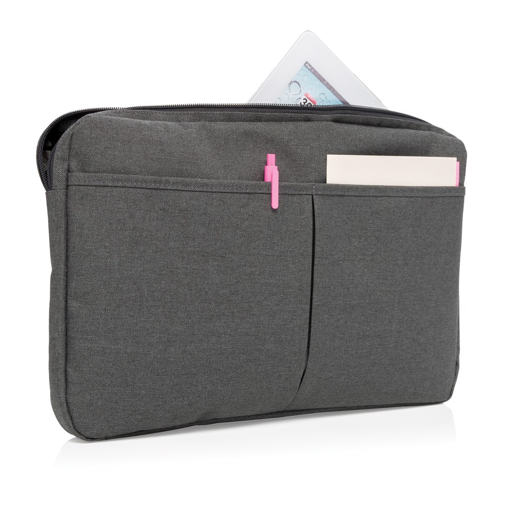600D polyester sleeve which not only carries your laptop but also has space to conveniently store your charger, cables, keys, etc. PVC free.
