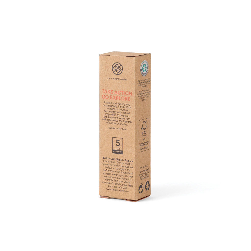 The Nordic Drift Trial Infinity Pocket Pen is designed for outdoor use and everyday adventures. The graphite tip slides out with the orange button for writing and retracts into the body to keep the tip protected. A webbing loop at the top allows the pen to be attached to a backpack so it is always within reach. Unlike traditional wooden pencils that write up to around 200 metres, the graphite tip of this infinity pencil can write up to approximately 20,000 metres. It writes like a regular pencil and the graphite markings can be erased while the tip wears down slowly. The pen is made with RCS certified recycled ABS. A small compass on the top provides a simple indication of direction. The item is packed in FSC® certified packaging without plastic. All Nordic Drift products are tested for quality. Because we strongly believe in the performance and durability of our gear, every item is backed by a 5-year warranty on manufacturing defects.