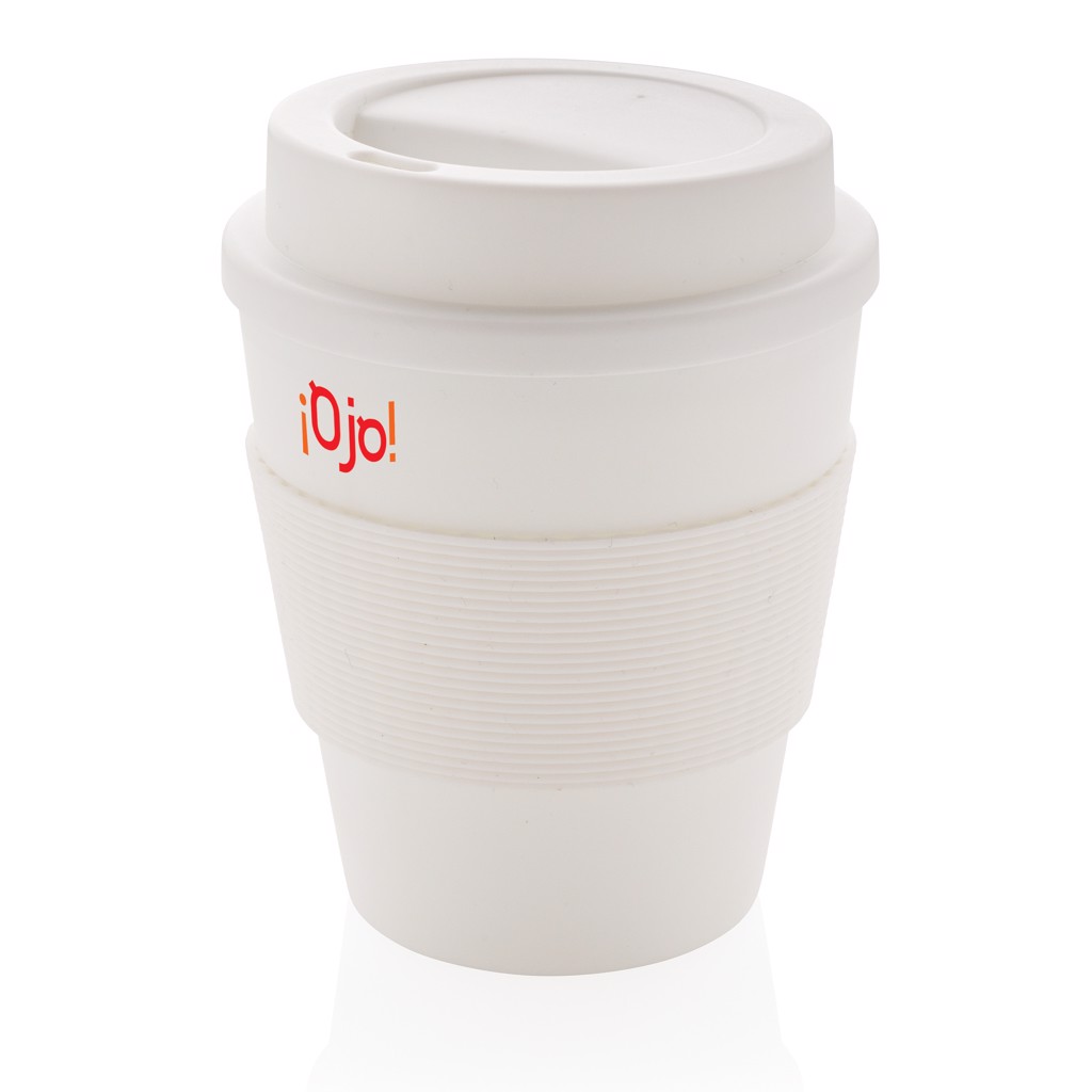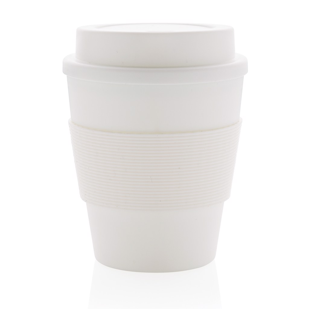 Stop single use! Bring your own cup and join the reuse revolution so you can contribute to a disposable free world. These lightweight and durable cups are perfectly suited to take your coffee on the go. These cups are reusable and made of 100% recyclable friendly PP material. The cups have a screw lid and a silicon sleeve. 100 degree Celsius food safe approved. Content: 350ml.