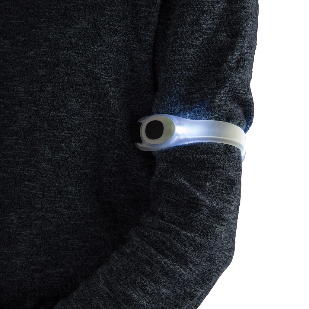 Safety strap with built-in led that can easily be strapped on your arm. The strap makes you more visible during outdoor activities in the dark.