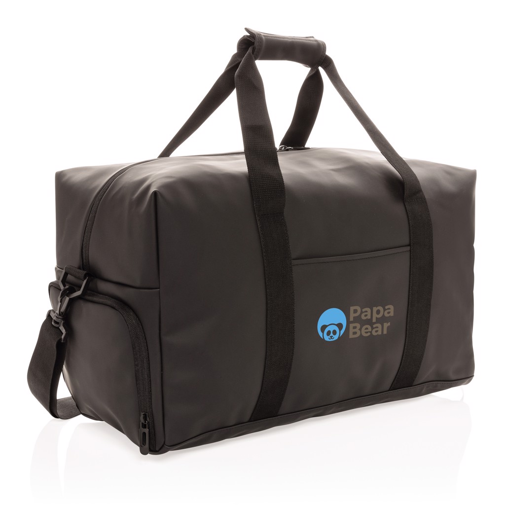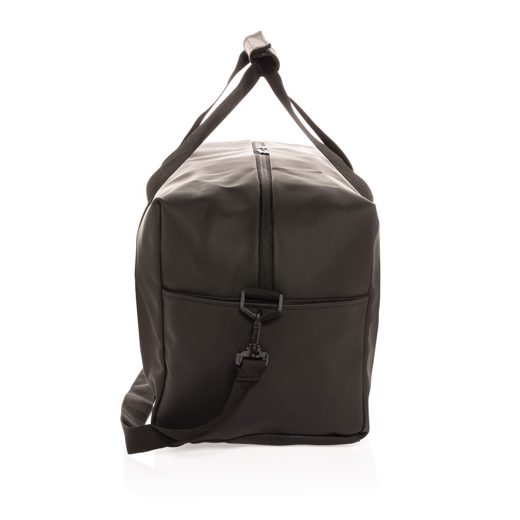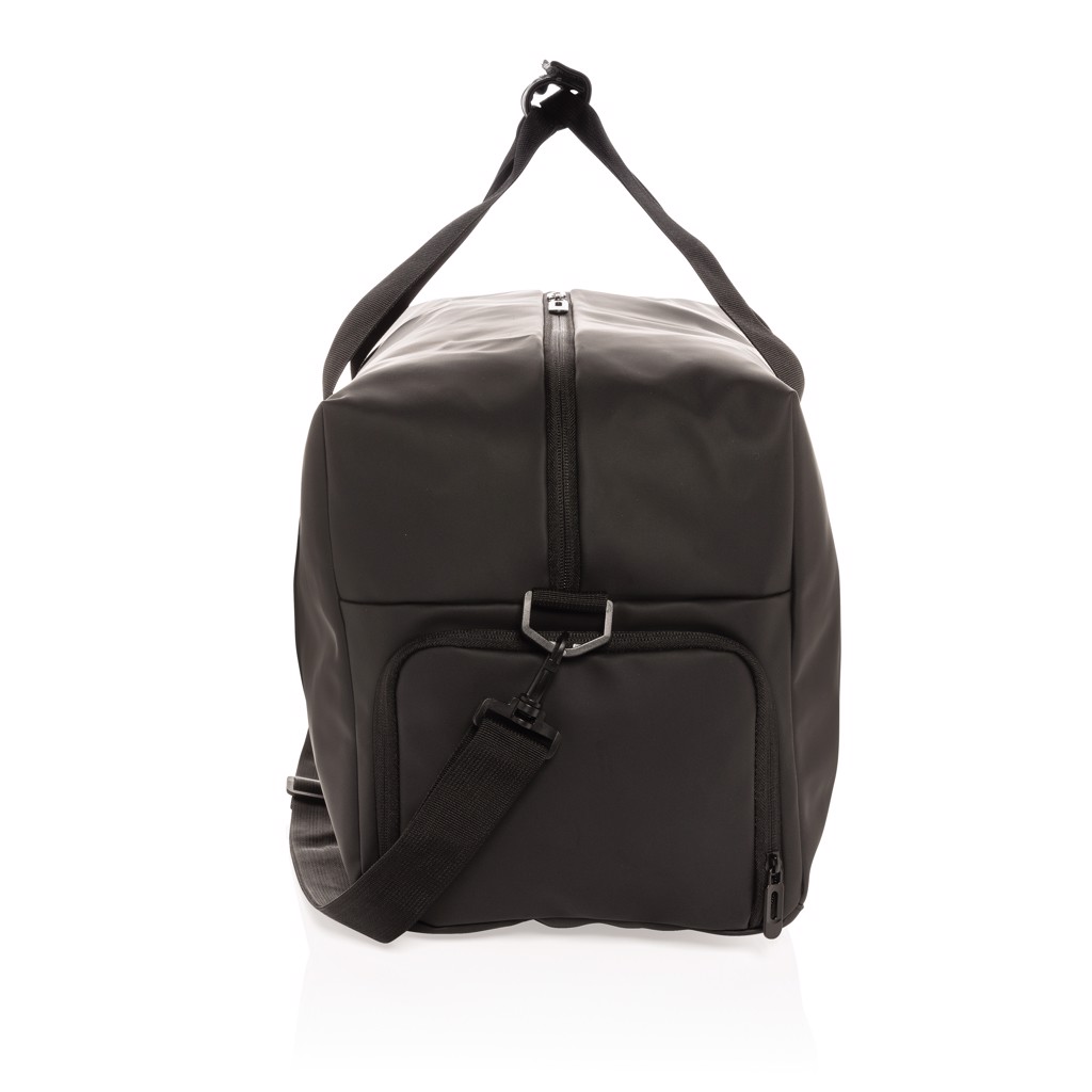 This weekend duffel made of smooth PU is suitable for daily trips to the gym as it is for a weekend getaway. It features a boxy minimalist design and has an external front pocket, inside pocket and a large main compartment. The bag has a convenient shoe compartment on the side. This bag can be worn over the shoulder or crosswise with the adjustable fabric carrying strap or carried by hand with the sturdy fabric handles. Exterior 100% PU. Interior 100% 210D polyester. PVC free.