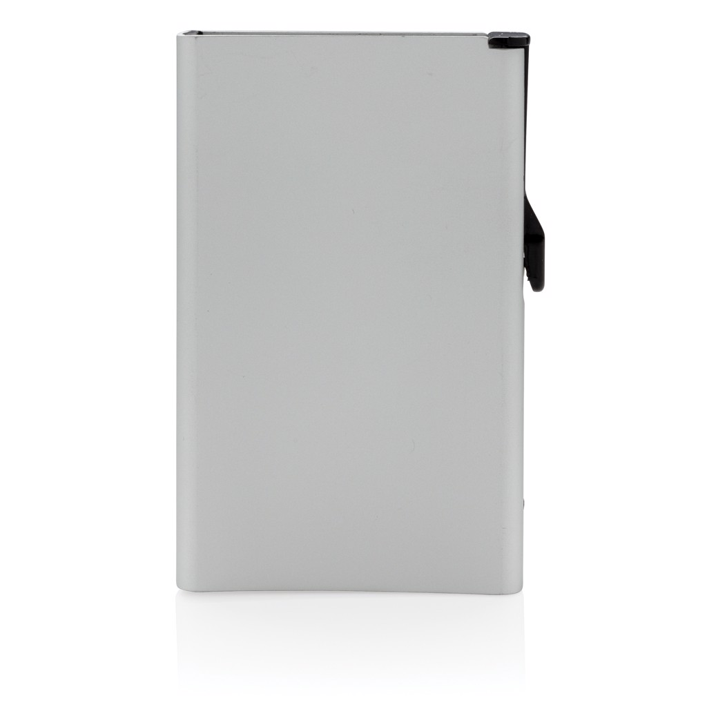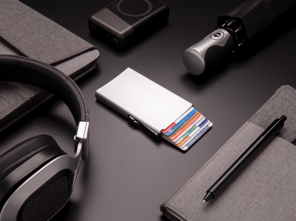 This solid aluminium cardholder is the ideal way to carry and protect your personal cards: credit cards, driver's license, debit cards and other cards. Fits up to 6 embossed cards or 10 cards. The easy side slider will push the cards up gradually. NFC (13.56 MHz) Blocking.