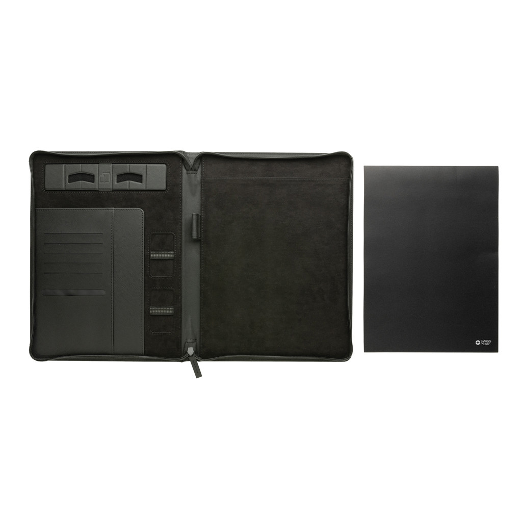 The Swiss Peak Heritage collection speaks the language of modern elegance. Presented in iconic Italian recycled PU cover with zipper . The inside provides a tablet/phone stand, gadget holders, business cards slots, sleeves for your notes and papers plus a pen loop. With lined 20 sheets A4 stone paper notepad. the portfolio is made with RCS (Recycled Claim Standard) certified recycled materials. RCS certification ensures a completely certified supply chain of the recycled materials. Made with 100% recycled RCS certified recycled PU. Total recycled content: 9% based on total item weight. PVC free.