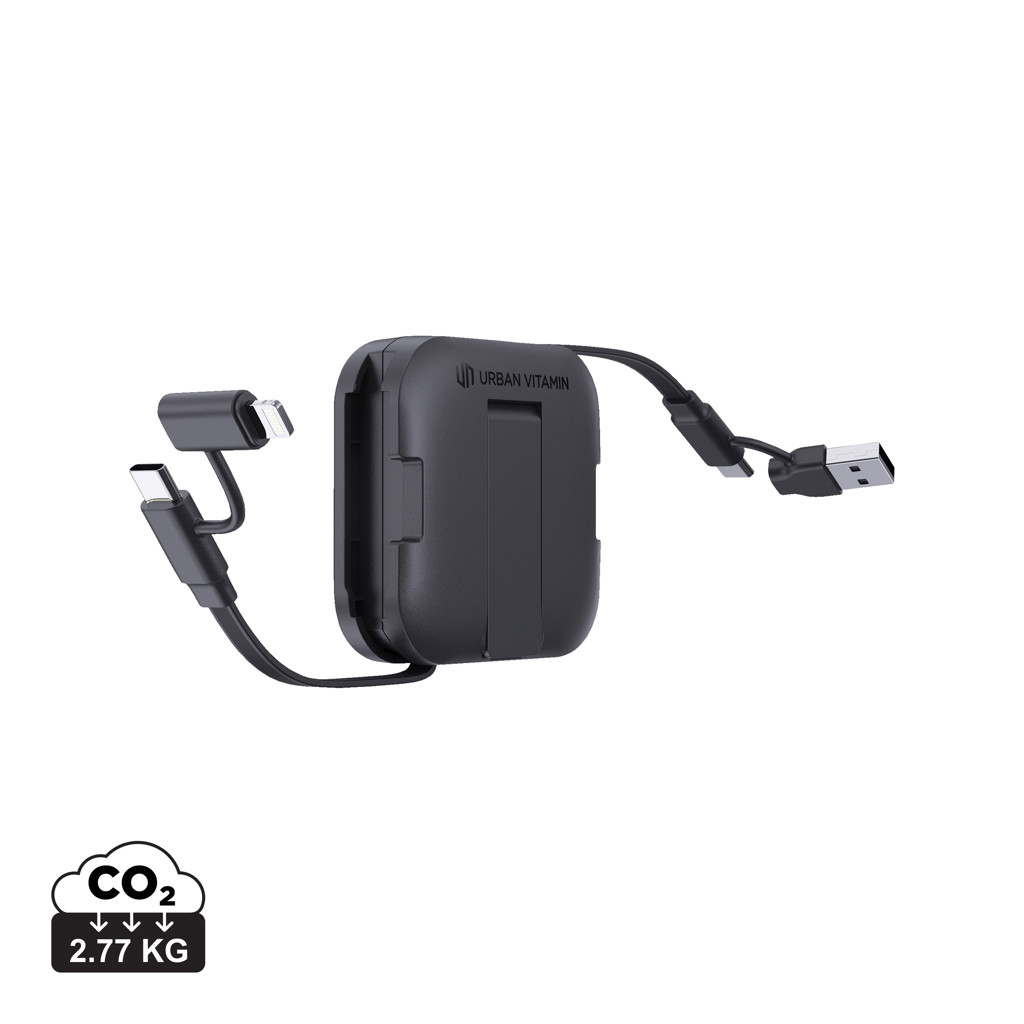 The ultimate all-in-one charging solution. San Jose is a 100W phone stand with an integrated retractable charging cable that delivers super-fast power and convenience. With its magnetic phone stand and kickstand, San Jose keeps your phone secure and propped up at the perfect angle for hands-free use — whether you're watching videos, video calling, or using CarPlay.The retractable RTPE cable extends up to 100cm and offers super-fast charging, supporting up to 100W power delivery with the USB-C to USB-C cable. It also comes with USB-A to USB-C and USB-A to iOS connectors, making it versatile enough to charge a wide range of devices. Plus, it supports data transfer for seamless file syncing while you charge. San Jose is made with RCS (Recycled Claim Standard) certified RABS & RTPE materials. Total recycled content 59% based on item weight. Urban Vitamin items are made without PVC and packed in plastic-reduced packaging.