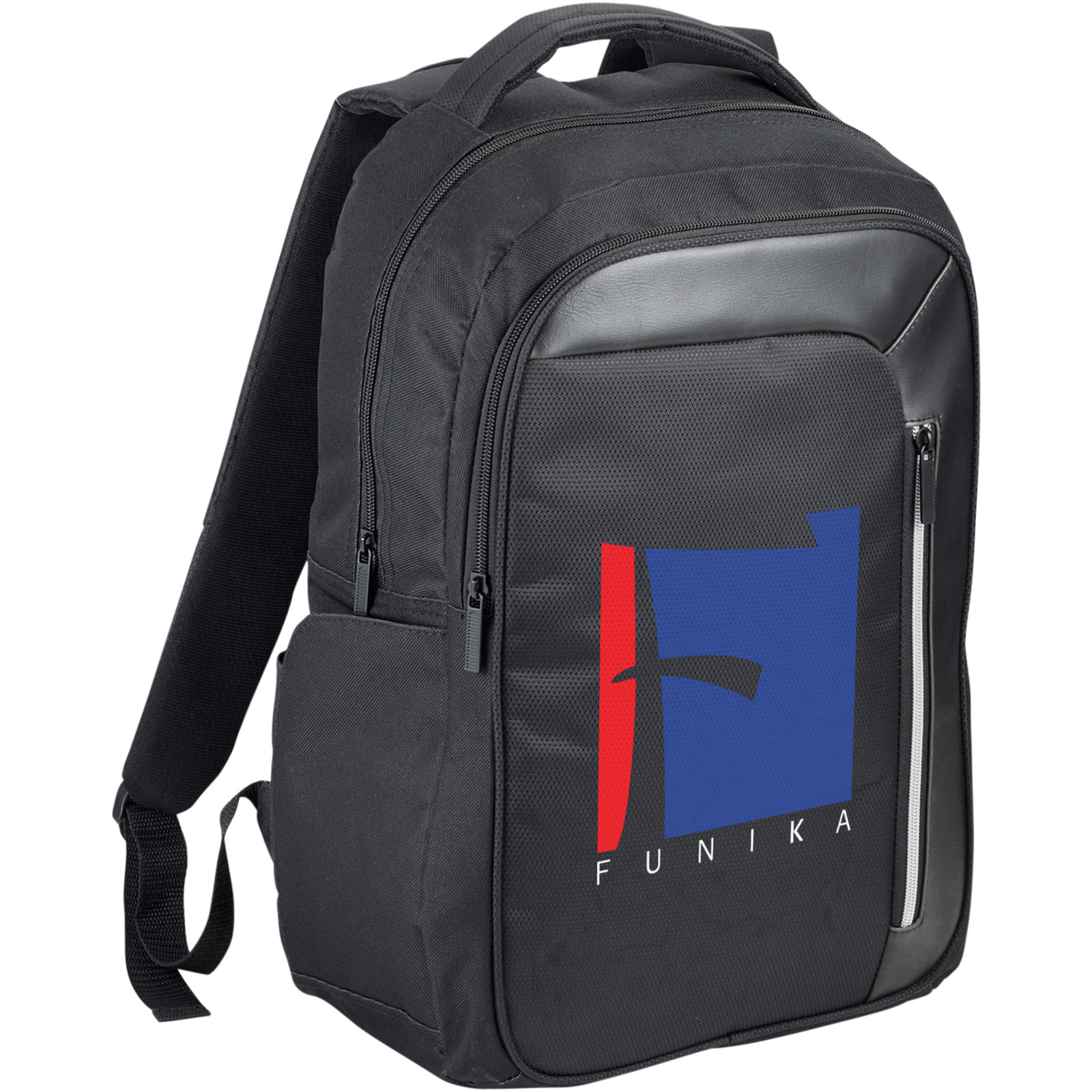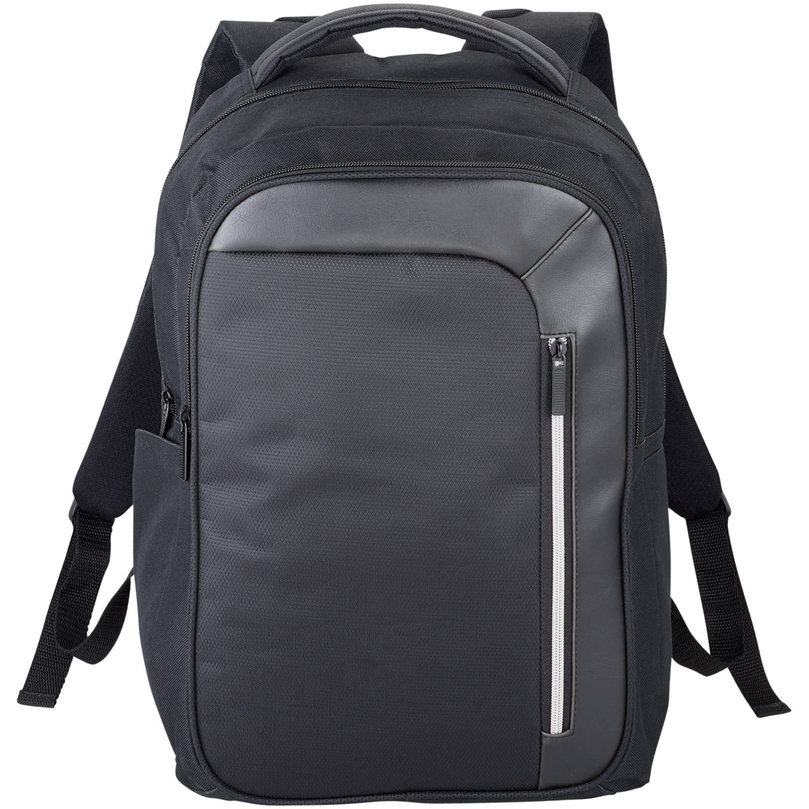 A 15" laptop backpack with multiple pockets, a padded back, and adjustable padded shoulder straps. Equipped with RFID protection and an interior organisation panel, including a key holder. There may be minor variations in the colour of the actual product due to the nature of the fabric dyes, weaves, and printing.