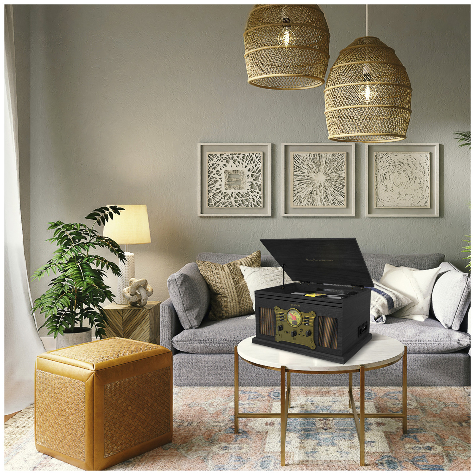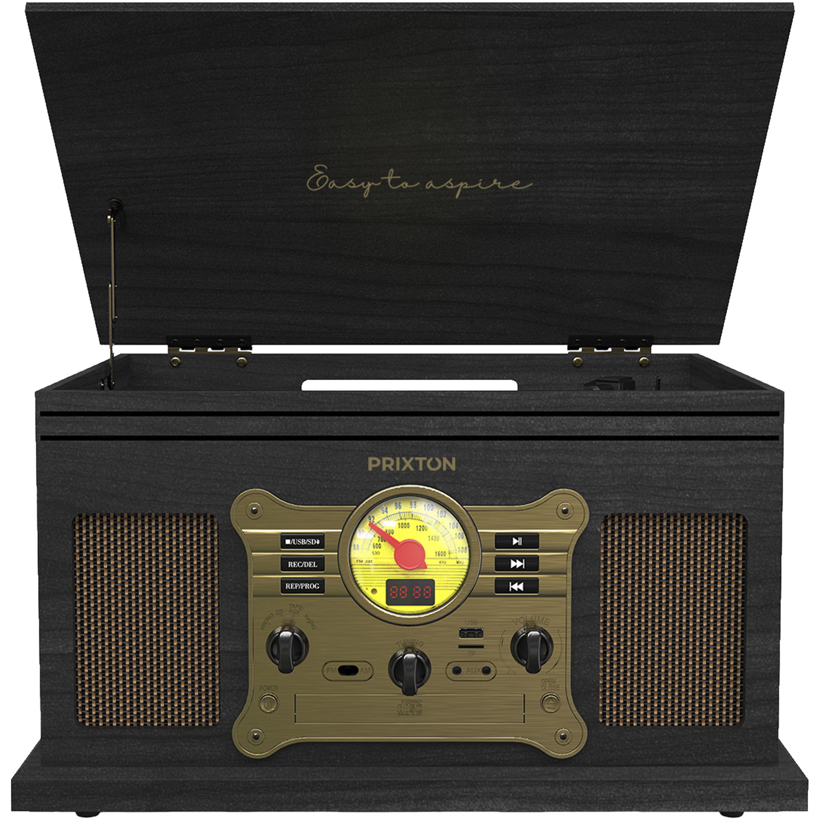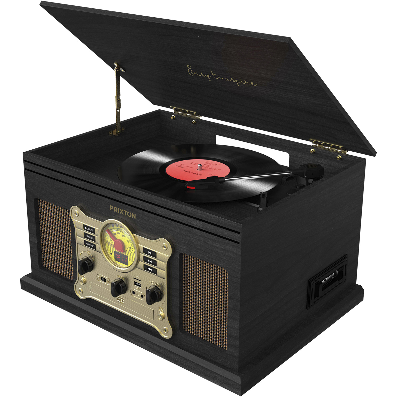 Проигрыватель, который воспроизводит виниловые пластинки и преобразует звук в цифровой формат через USB и SD-карту. Он также воспроизводит музыку через Bluetooth®, USB, SD-карту, радио, CD и кассеты. Проигрыватель имеет 2 стереодинамика мощностью 3 Вт каждый и 2 аудиовыхода (разъем 3,5 мм/RCA). В комплект поставки входит адаптер 45 об/мин для установки виниловых пластинок различных размеров.