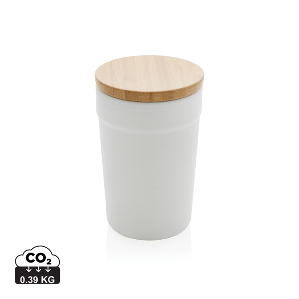 This beautiful tumbler with bamboo lid is made with GRS certified recycled PP. GRS certification ensures a completely certified supply chain of the recycled materials. The tumbler features a bamboo lid for on the go usage. Total recycled content: 52% based on total item weight. BPA free. Capacity 300ml. An FSC®-certified kraft box is included.