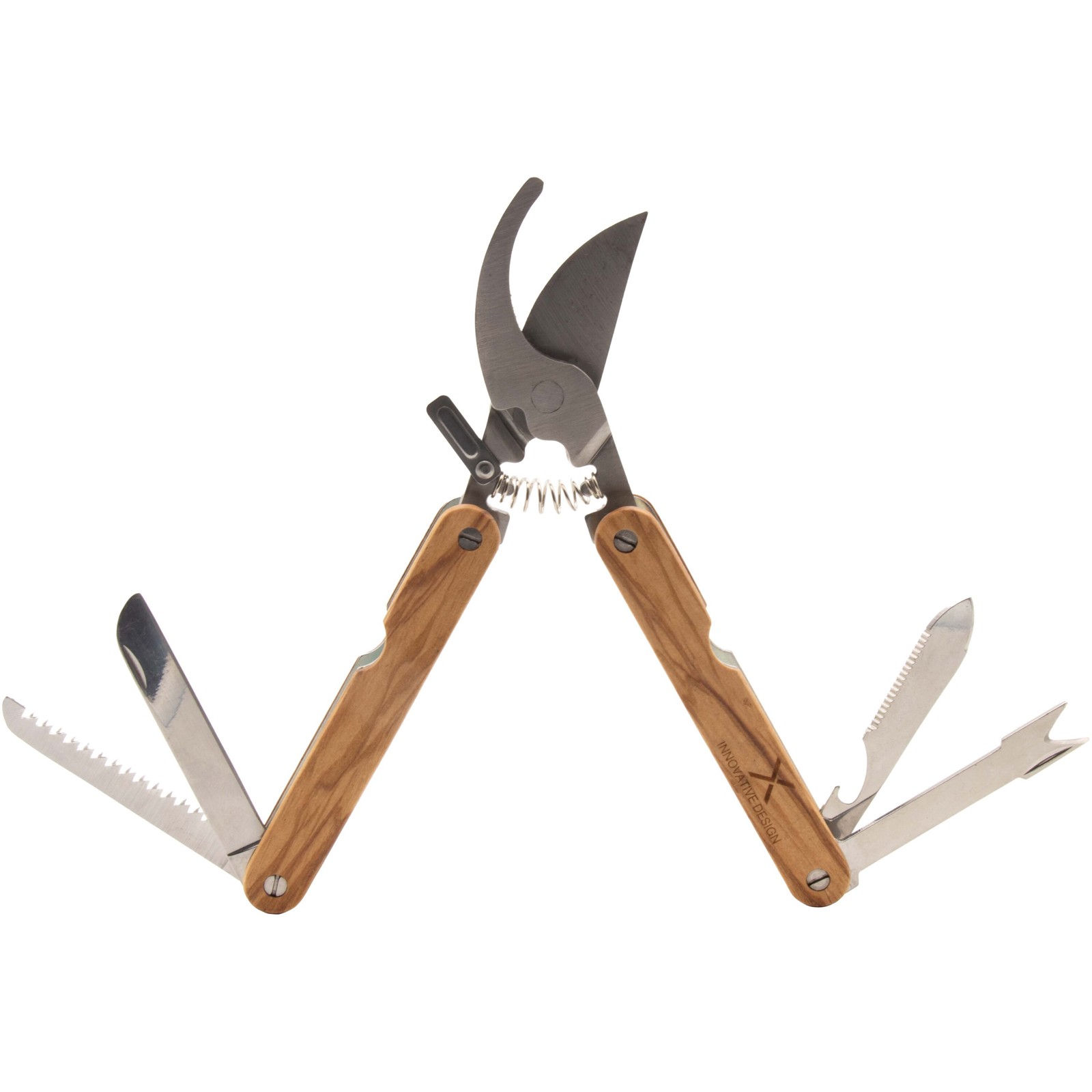 Набор из 2-х многофункциональных инструментов: Один молоток/клещи 10-в-1 и секатор 6-в-1, изготовленные из нержавеющей стали и древесины итальянского оливкового дерева. Поставляется в подарочной коробке из переработанного картона.