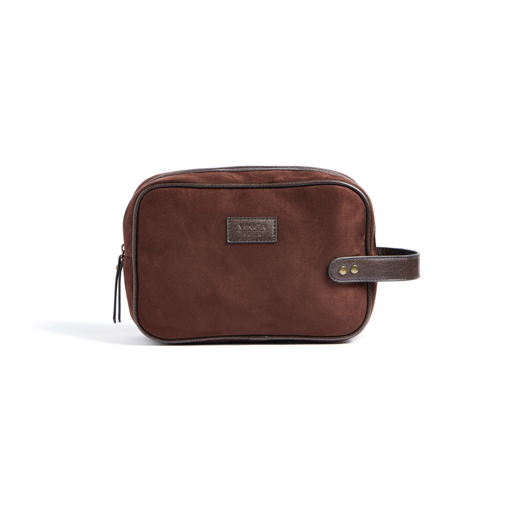 Classic yet modern washbag in suede imitation with details in PU leather. The bag makes it easy for you to store your hygiene items in style, both at home and during travel. The bag comes in a handy size and is easy to carry, thanks to a strap with brass details on the short side.