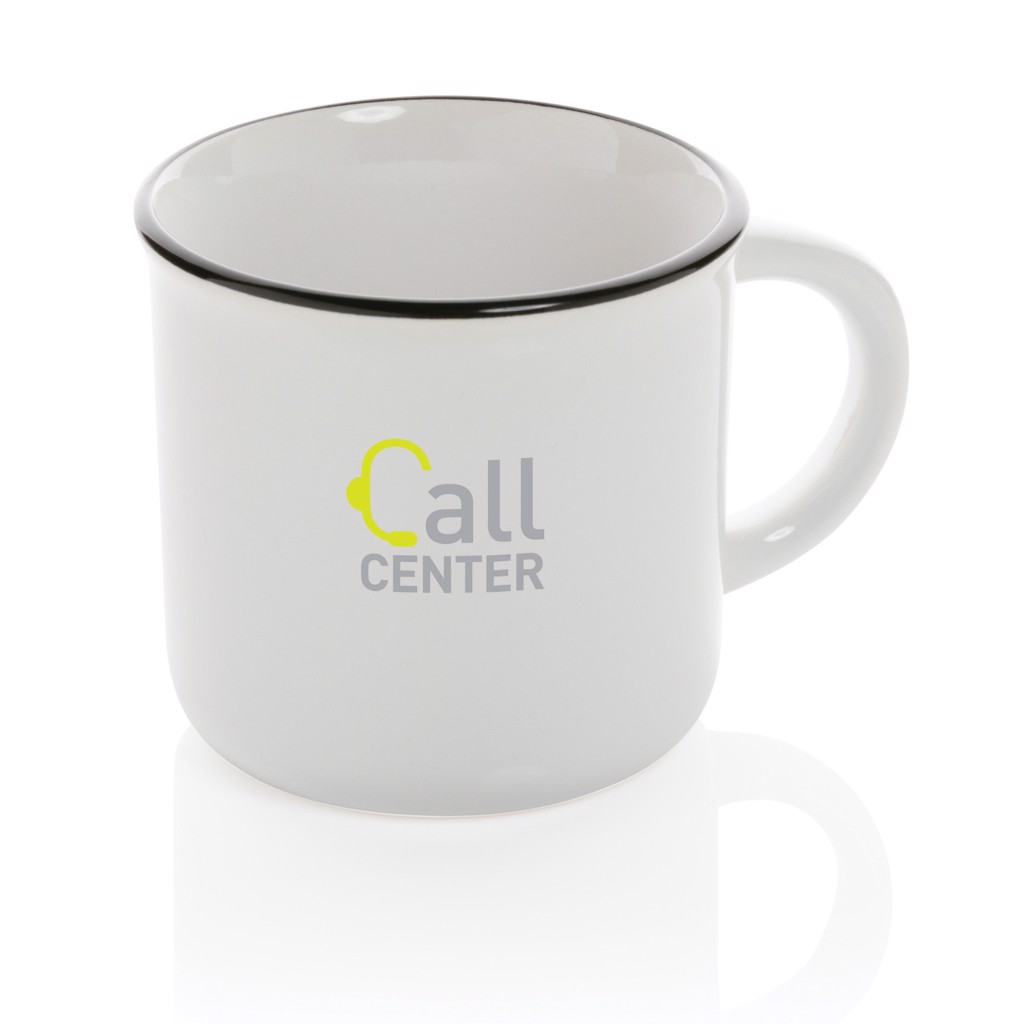 This mug is made from ceramic for durability and lasting use. The mug has a vintage look and features a curved handle for easy grip. Dishwasher safe in accordance with EN12875-1 (at least 125 washing cycles) for all decoration methods. Packed in gift box. Capacity 280ml.